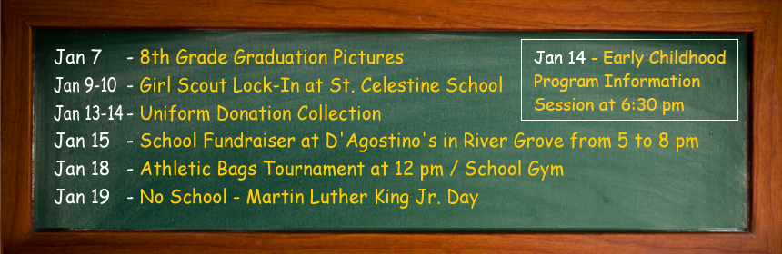 Read more »St. Celestine School is very excited to announce the upcoming Catholic Schools Week events, which are shared in the list below and in additional flyers in this week’s Brown Envelope… – On Sunday, January 25, we will have an Early Childhood Information Session at 9:30 am, Family Mass at 11 am – Students who come in uniform and check in with their teacher at Mass will receive an out-of-uniform pass. This special Mass is being celebrated by Cardinal Cupich, and Open House from 12 pm to 2 pm – Come see all of the amazing, exciting, and interesting things happening at St. Celestine School!… – Monday, January 26 – The Future’s Looking Bright!… – Tuesday, January 27 – We Are Family!… – Wednesday, January 28 – We Rock Around the Clock!… – Thursday, January 29 – We are the Champions!… – Friday, January 30 – We’re Having the Time of Our Lives!… – Registration for the 2026-2027 school year is ongoing. Please note that after January 23, 2026, the registration fee increases to $125. Please also note that there may be grades where space is limited and securing a spot now is advised… – And More…