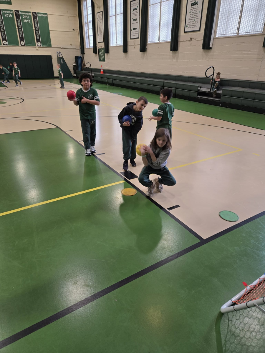 Let’s play catch! – Preschool through Second Grade Students practice their catching and throwing skills in Gym Class.