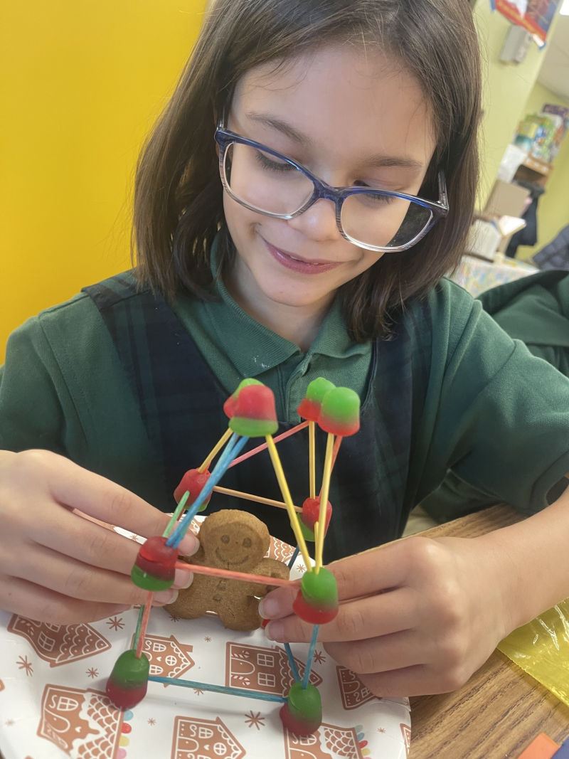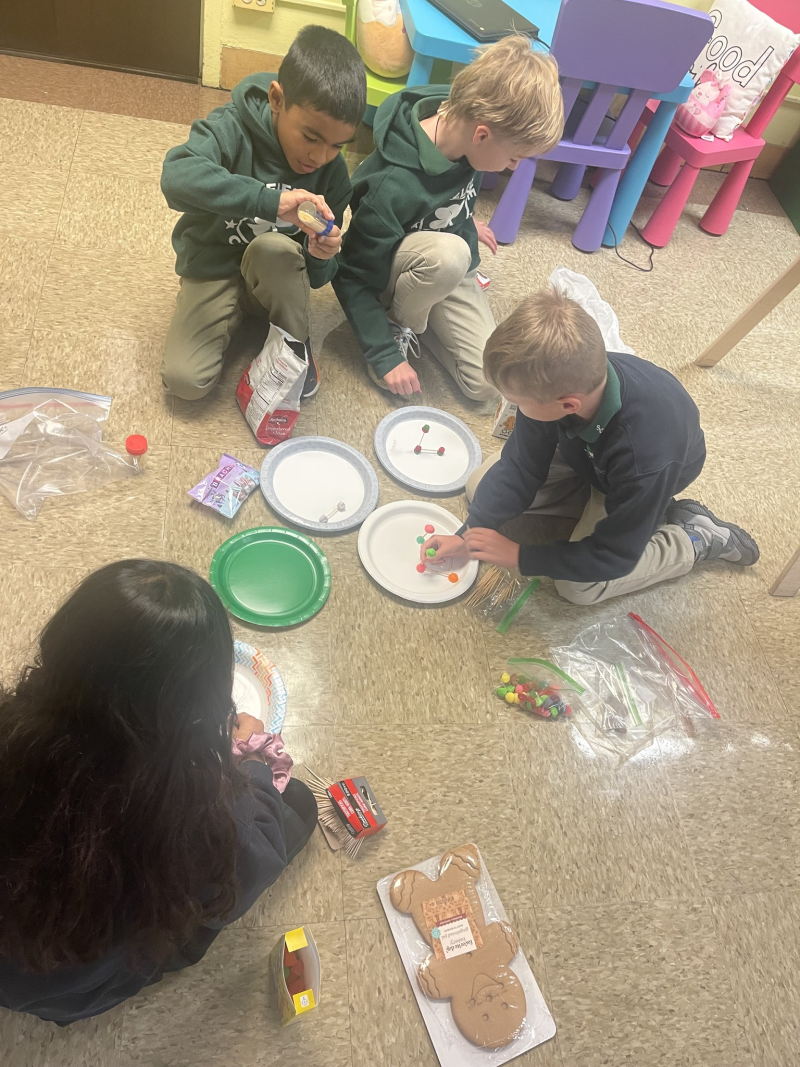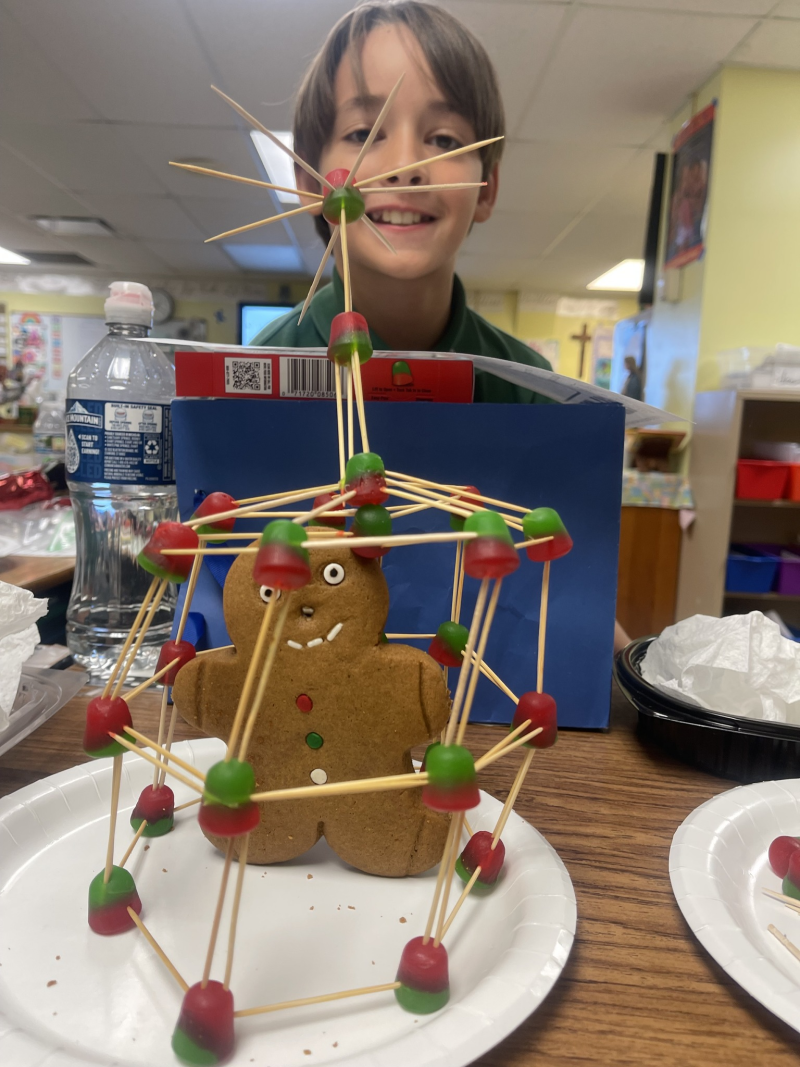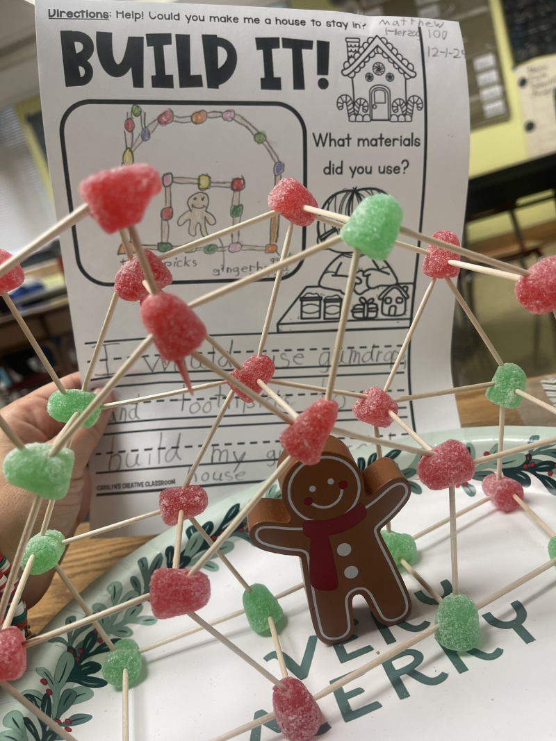 Students used toothpicks and gumdrops as construction materials for their gingerbread person’s home. The goal was for each student to be an engineer and build a structure to fit their sized gingerbread cookie. Prior to the activity students listened to a read aloud entitled: The Plan for the Gingerbread House by Darcy Pattison and pictures by John Joven. As a whole class we discussed what a blueprint is and each student individually created their own blueprint. After construction students re-illustrated their blue print to show the modifications made from their original. Students collaborated and brainstormed collectively to engineer and construct a suitable structure for their gingerbread. Our gingerbread structures were a festive and fun way to engage the students and build their critical thinking skills, cooperative learning, collaboration, perseverance, planning, and design. This science theme focused on incorporating growth mindset, and leadership skills for the students.