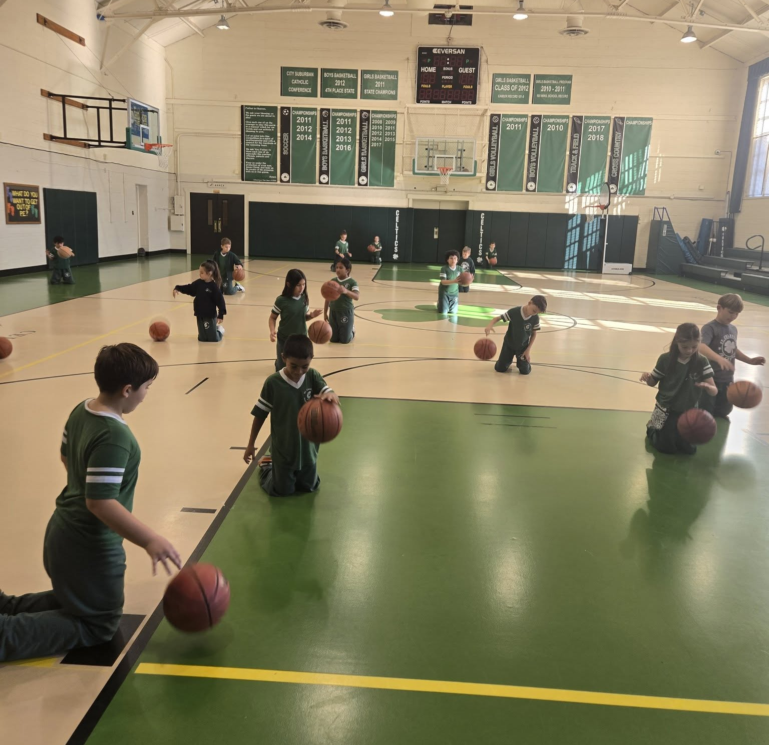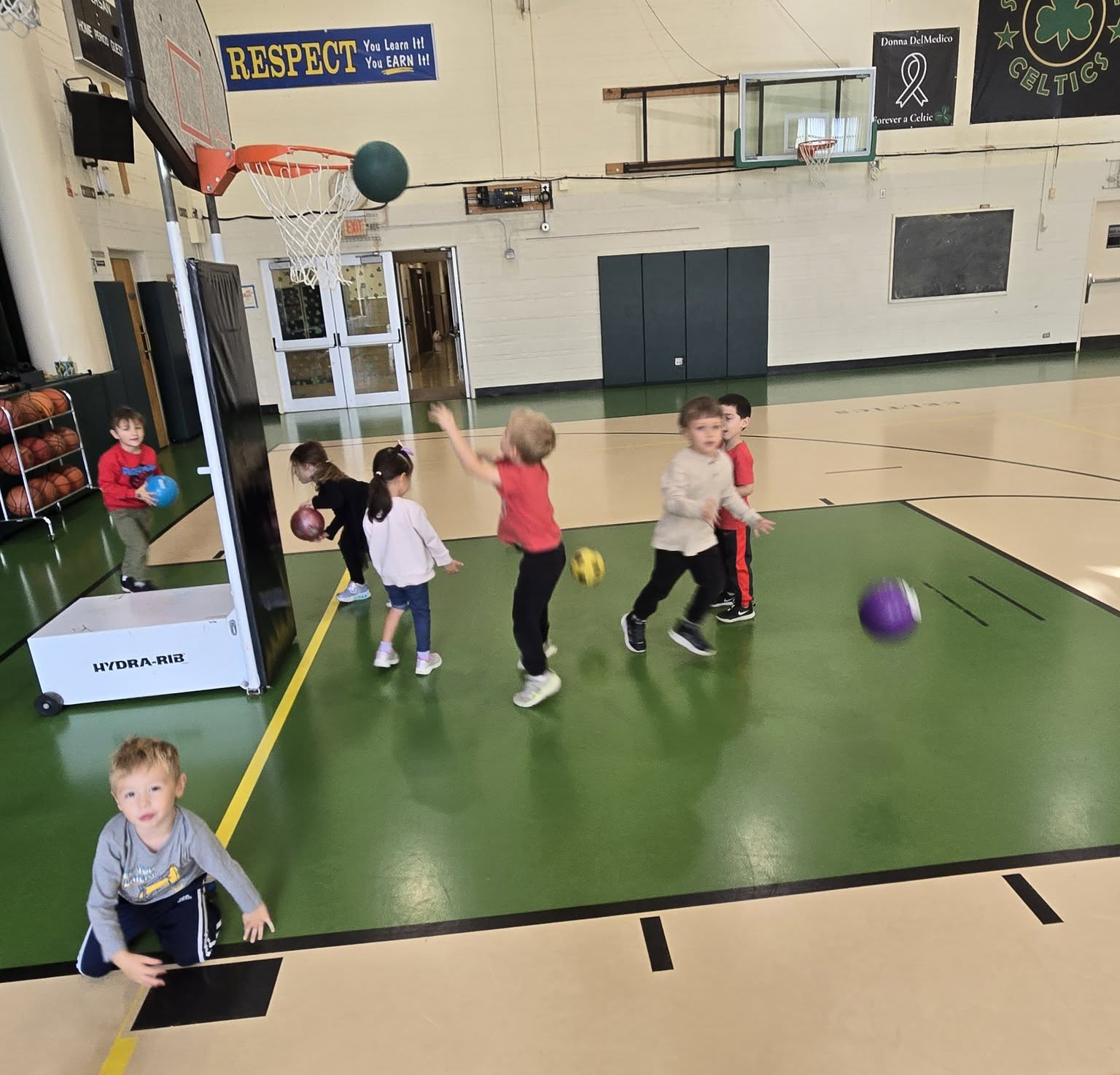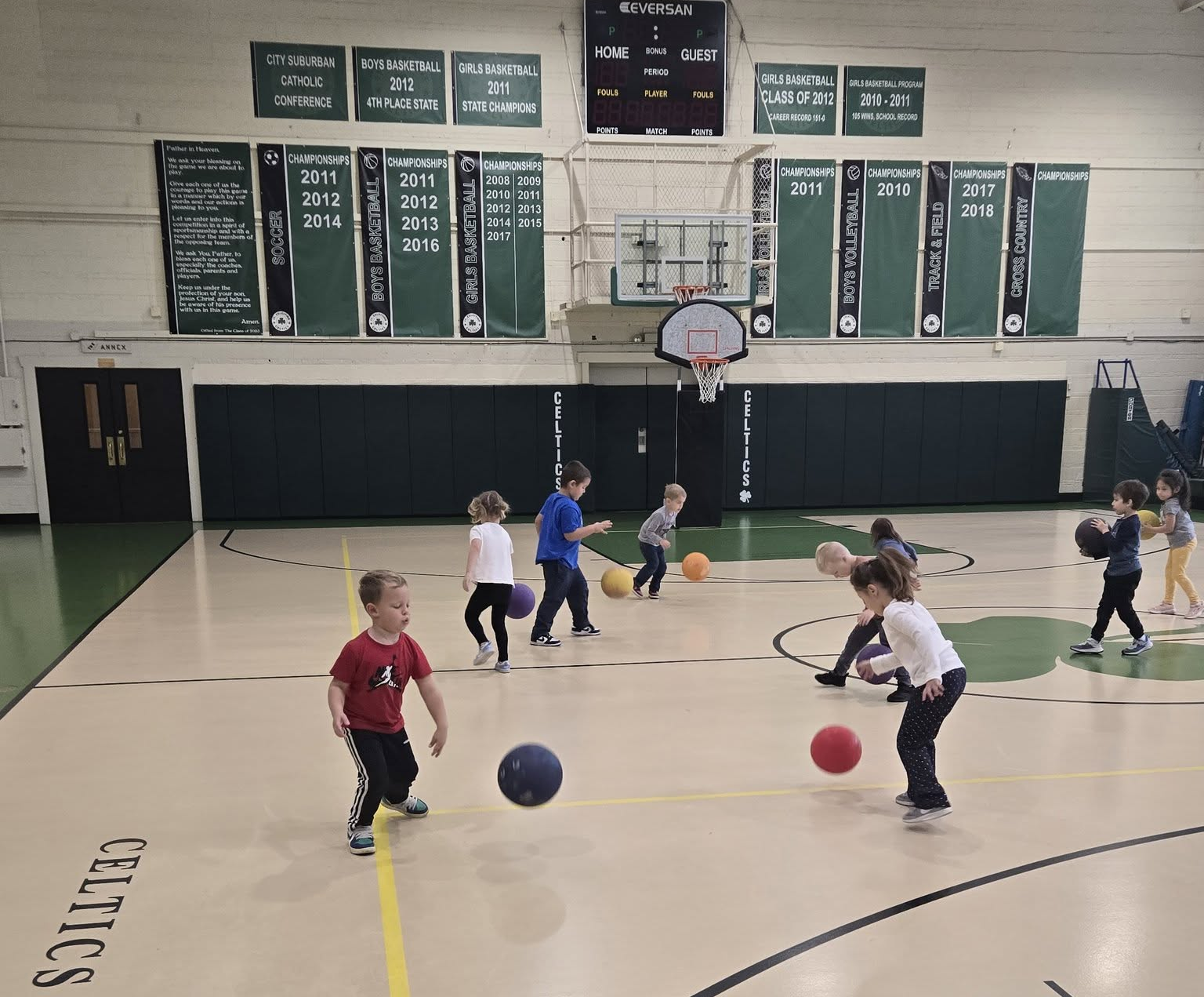 It’s Basketball Season in Gym Class! – Preschool and Kindergarten Students are learning how to dribble and shoot. The First and Second Graders learn how to dribble using the progression method, including dribbling on their knees. We have some basketball superstars in the making!