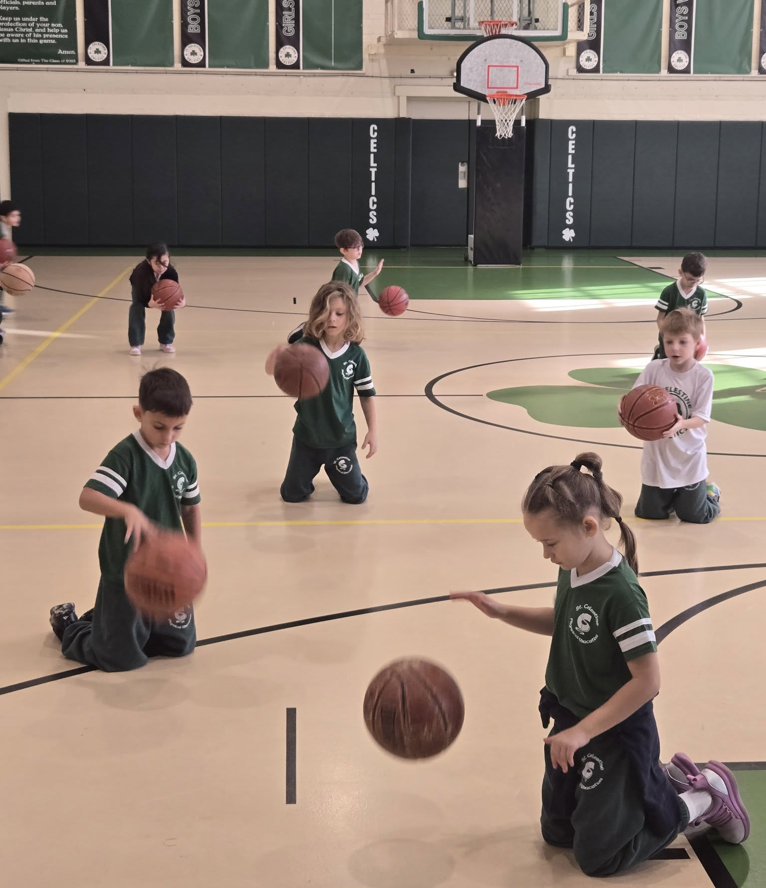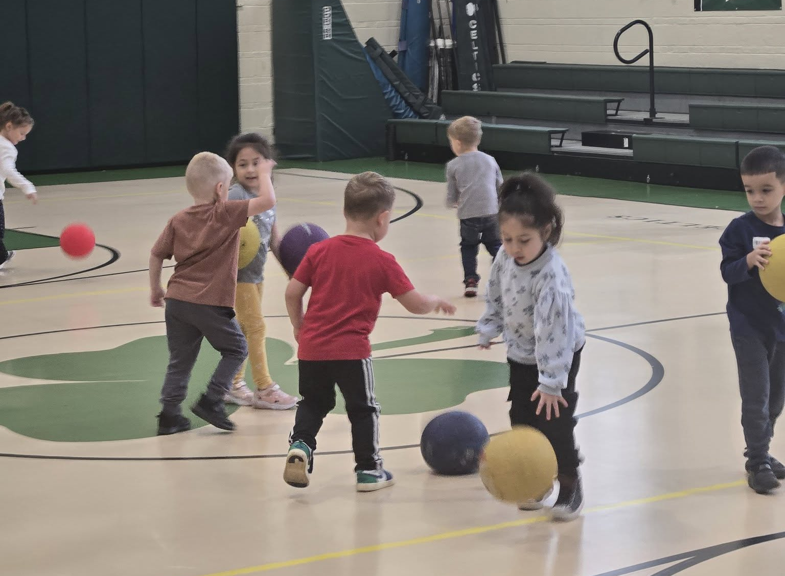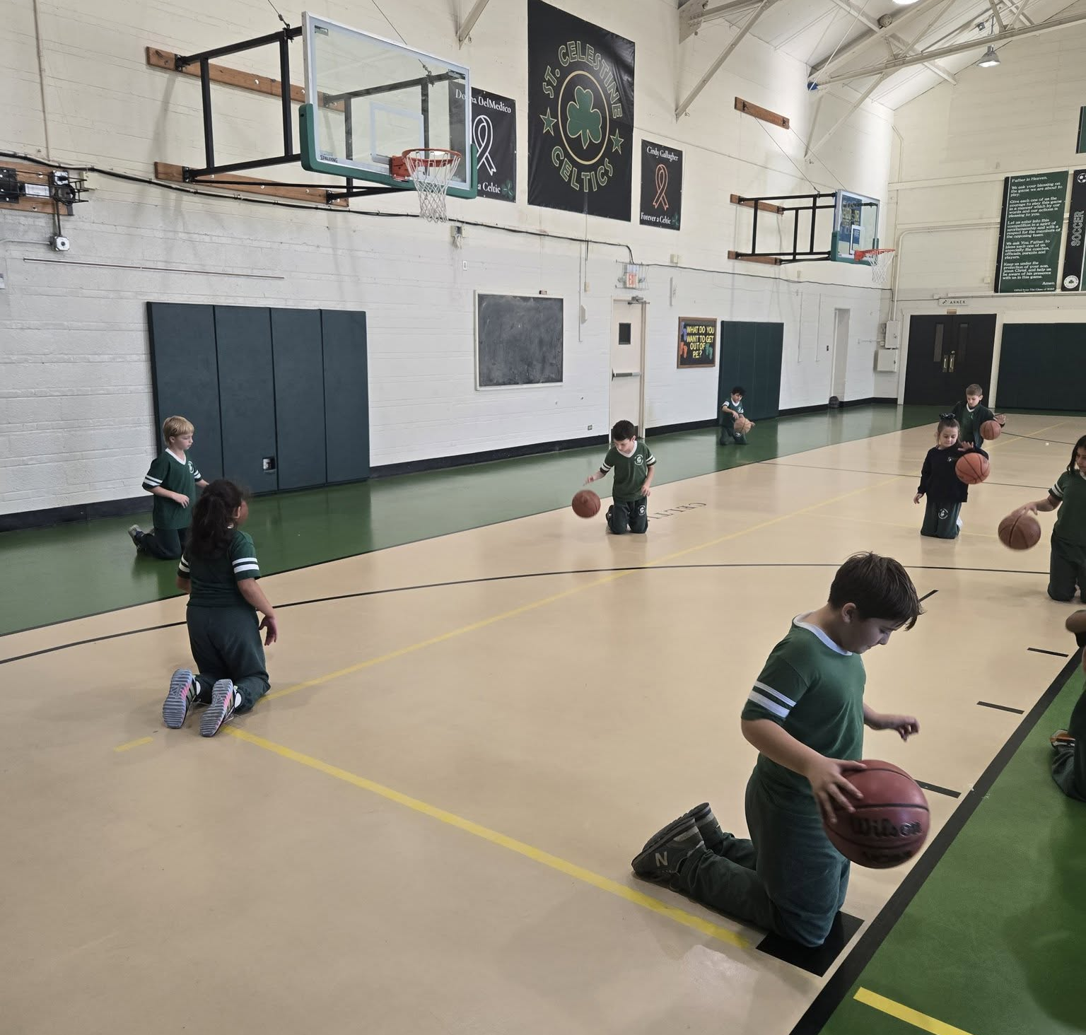 It’s Basketball Season in Gym Class! – Preschool and Kindergarten Students are learning how to dribble and shoot. The First and Second Graders learn how to dribble using the progression method, including dribbling on their knees. We have some basketball superstars in the making!