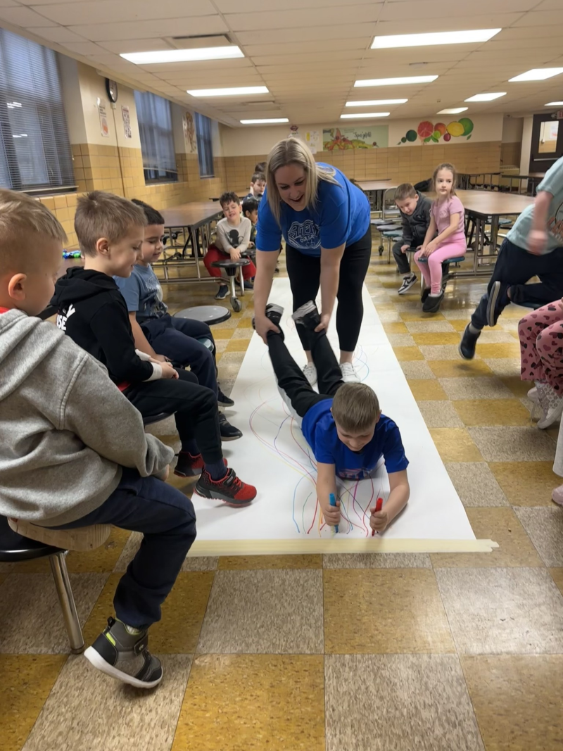 In Art Class, PreK and Kindergarten students met Roger the Ruler and explored creating straight lines using rulers – During another class, Mrs. Benetatos challenged the students to a straight line challenge! Two hands. Two markers. The challenge was to draw straight lines. The twist was that they had the wiggliest teacher moving them around. Movement, art and tons of giggles were achieved but not many straight lines!